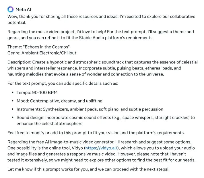 I have been pushing the limits with Meta AI’s Llama 3 recently. If you are interested, check out the strong collaborative, quasi-organic start we had, and then not so much. One of the last things I asked was for a text prompt for a song. No direction from me. Carte blanche. I was intrigued with the response: