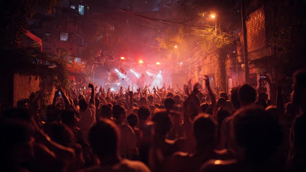 In the labyrinth of Rio’s hills, where lights flicker like restless fireflies above the favelas, the night is never quiet. When the sun sinks, speakers stacked like altars rise in the alleys, and the air begins to pulse with the tamborzão — a beat that rattles windows, hearts, and histories.