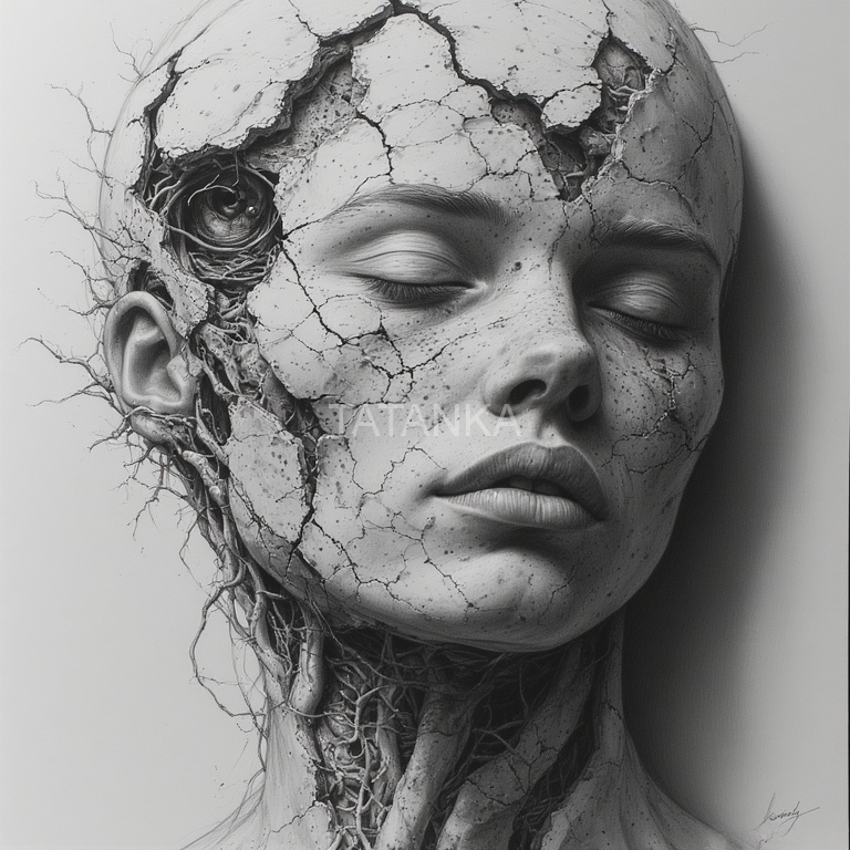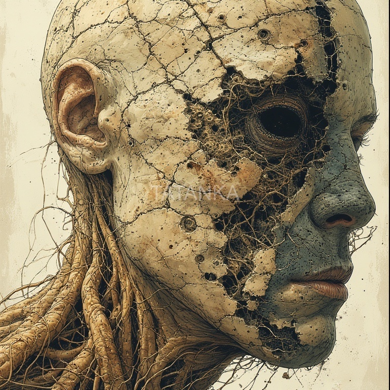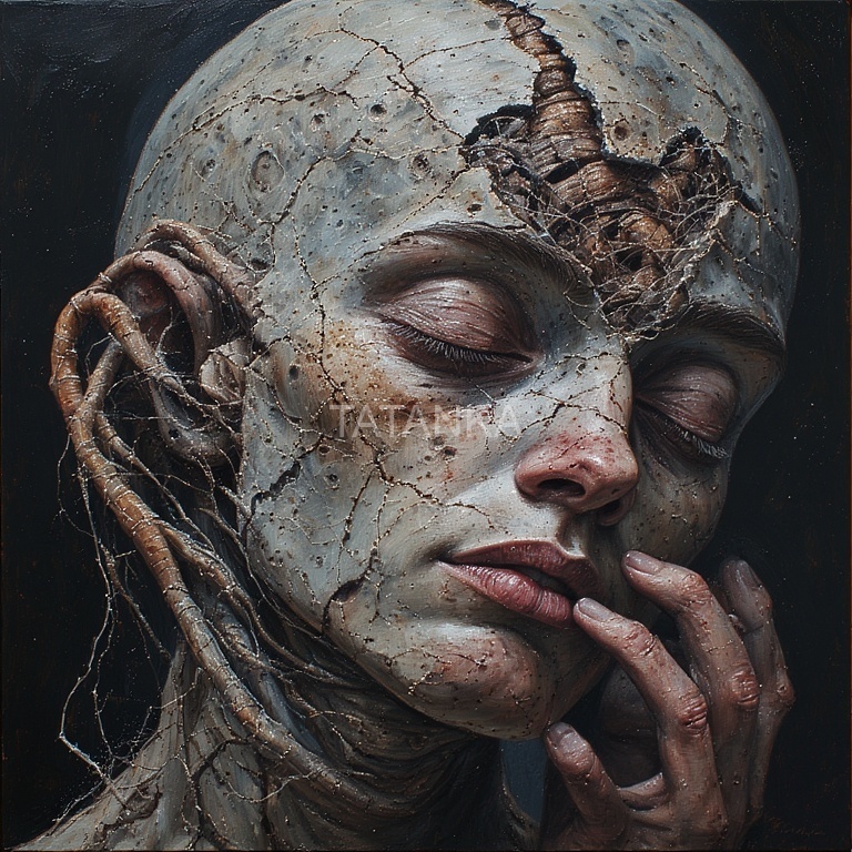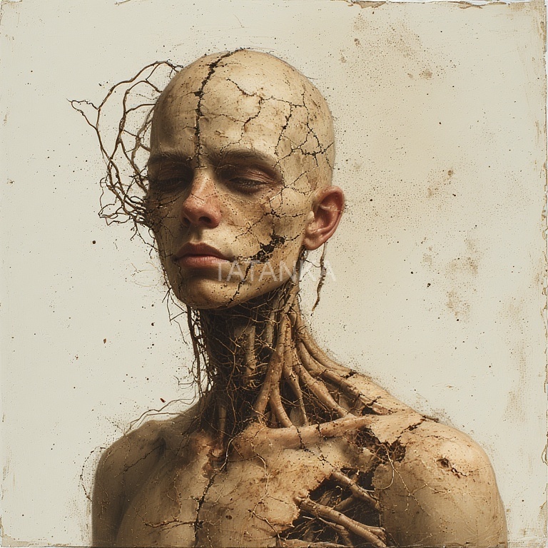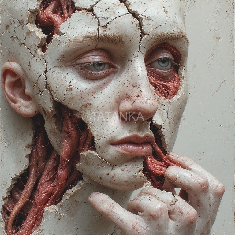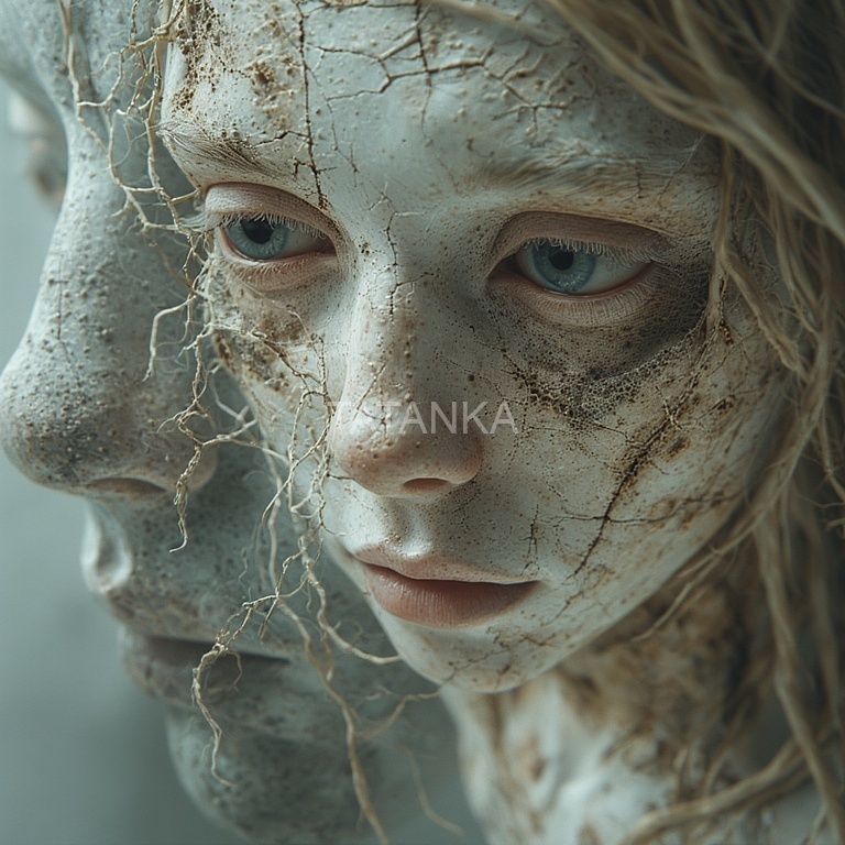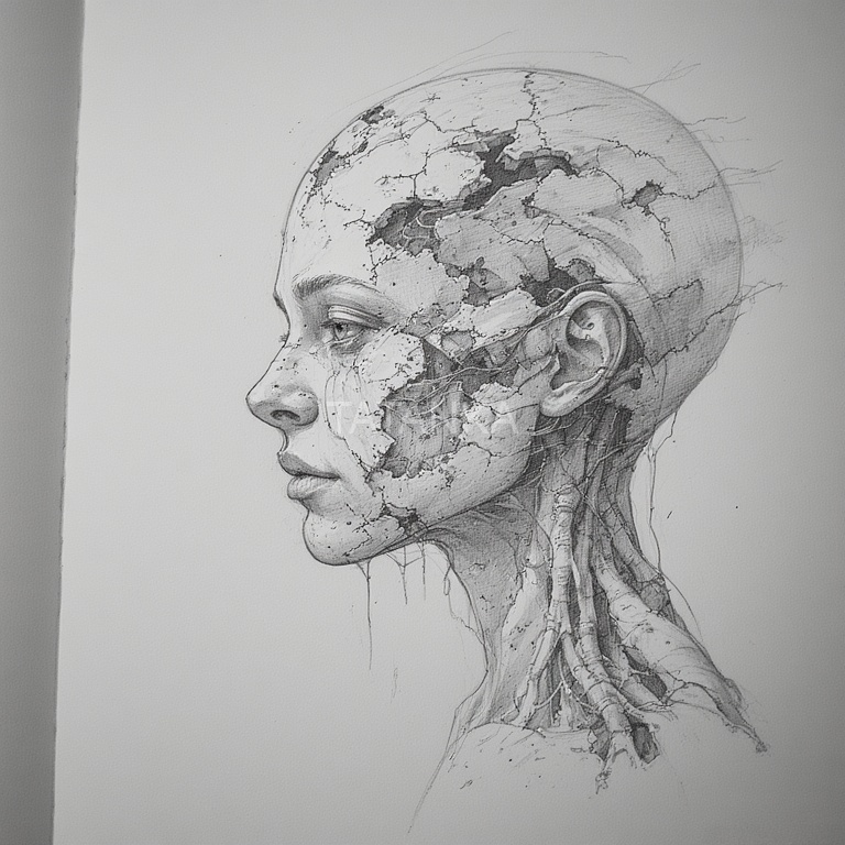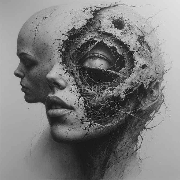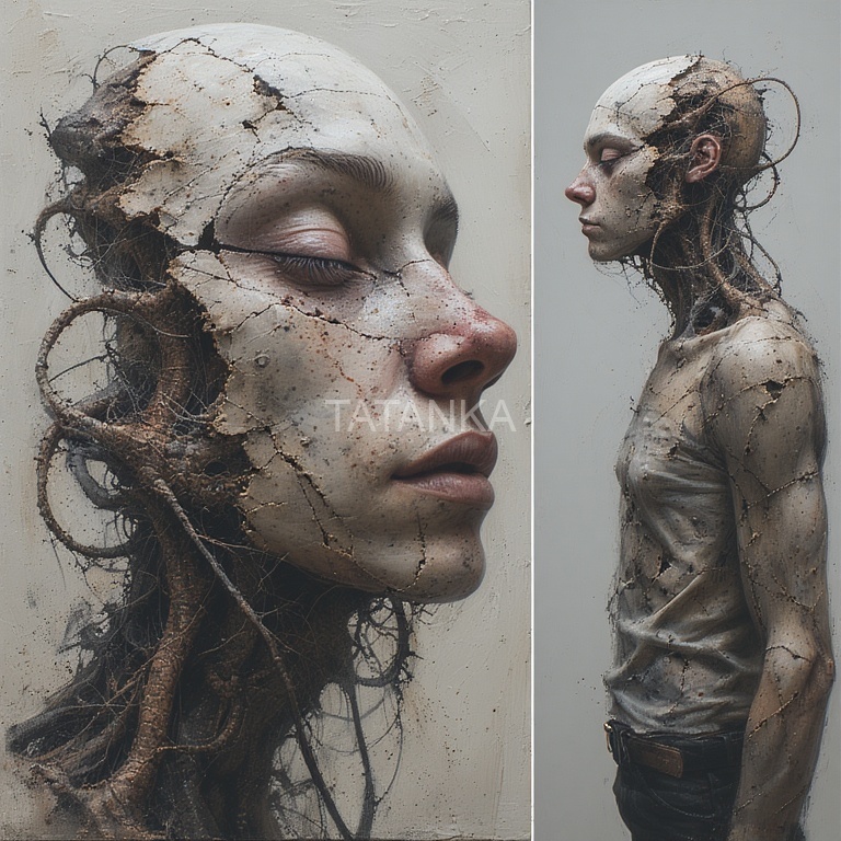 Identity is not treated as a stable core but as a surface under strain. Symmetry is often incorrect. Two expressions may coexist on one face. Eyes may gaze toward different temporal moments. Gender can be ambiguous. Age is indeterminate. The edges of the body sometimes dissolve, as if the figure cannot fully agree with itself.