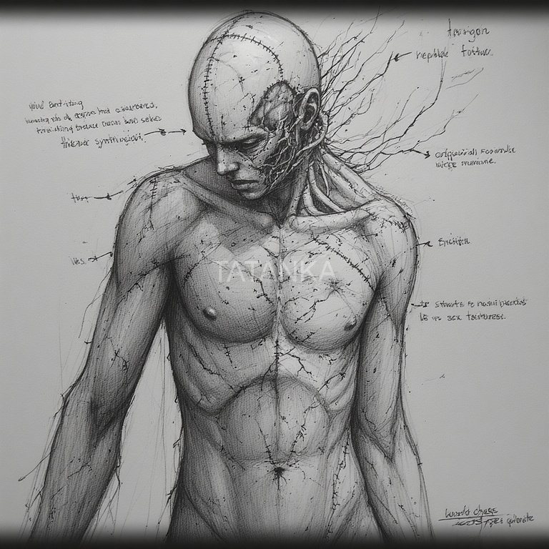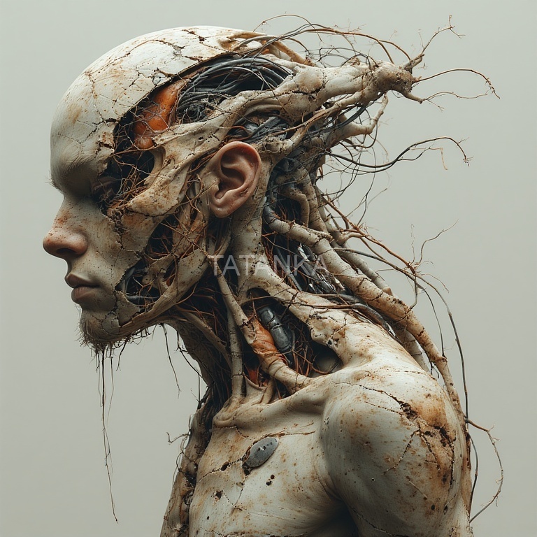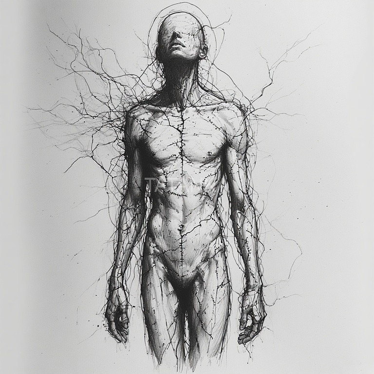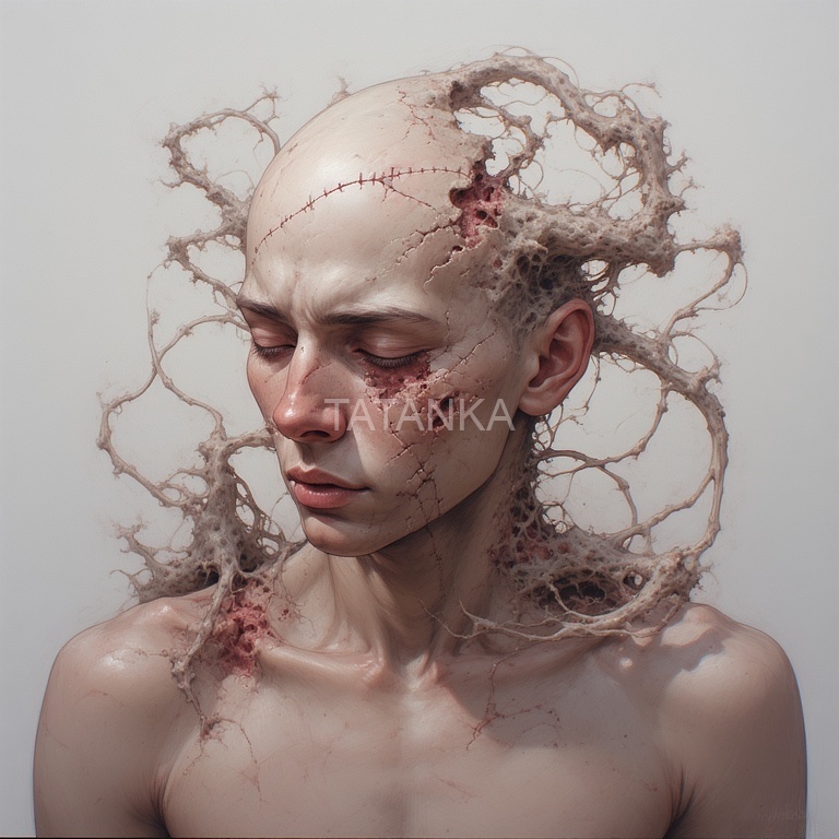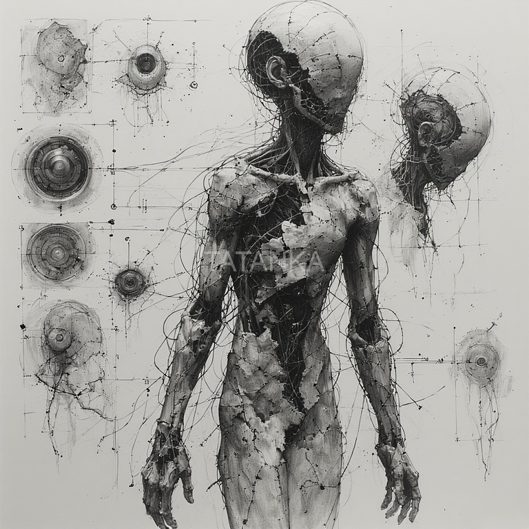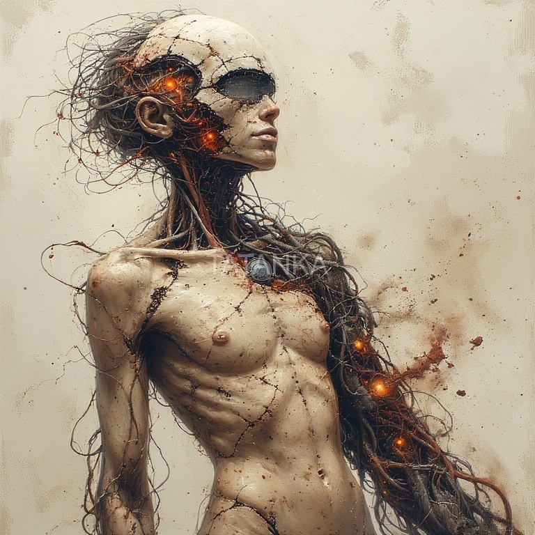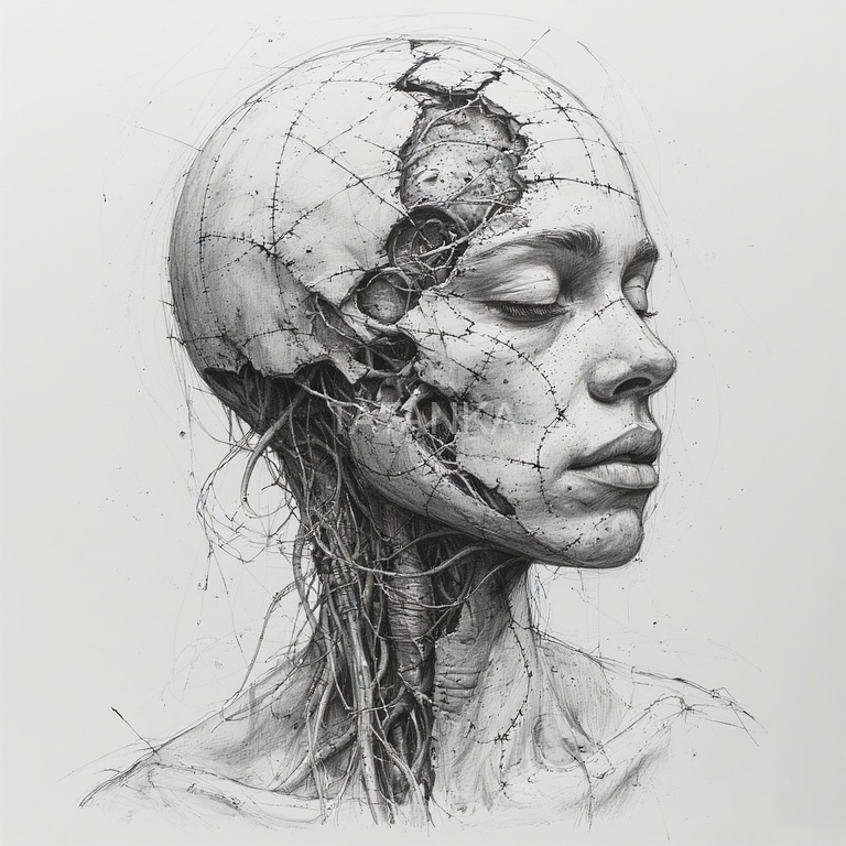 Each image presents a solitary human figure in a state of becoming and erosion. Flesh and machine are not opposed here. They are entangled. Identity is neither intact nor destroyed, but partially erased and partially overexposed. Faces blur, fracture, duplicate. Bodies carry seams, stitches, scars, and visible repairs. These marks are intentional. They are evidence of labor, of failure, of care, of intervention.